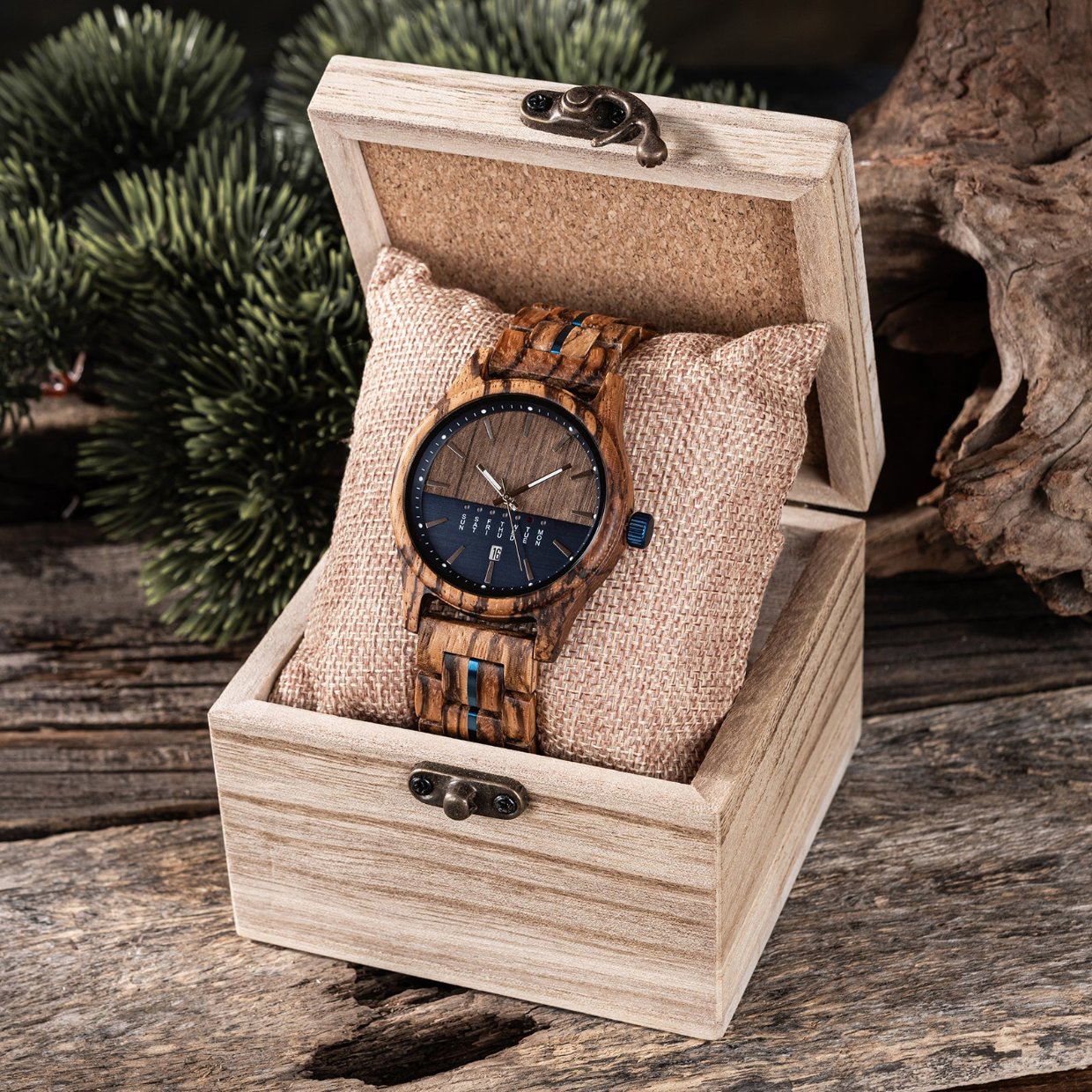 Un reloj de madera es ideal para la persona perspicaz que aprecia piezas únicas. Luzca con estilo mientras se mantiene al tanto de sus días con este reloj de madera único y artesanal. Tiene una banda de madera ajustable que muestra su grano de madera bellamente natural. The Parallel también viene con un cilindro de bambú hecho a mano.
